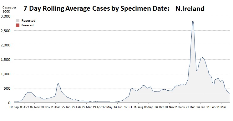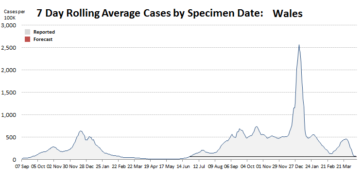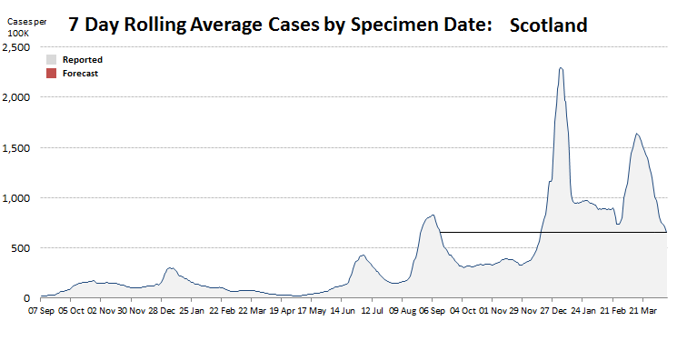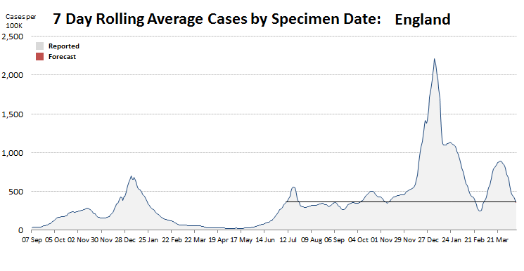 The charts below show the rolling 7-day Covid-19 case rate per 100,000 people. Cases reflect Specimen Date. The black horizontal line on each chart shows the last date when cases were at current levels.
