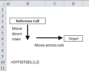 The function then moves to a Target cell, in this case D6. This target cell is reached by moving down 3 rows and across 2 columns - based on the rows and cols inputs in B10.