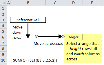 In this examples, the OFFSET function is wrapped in a SUM function, so B10 would evaluate the sum of the range D6:E10.