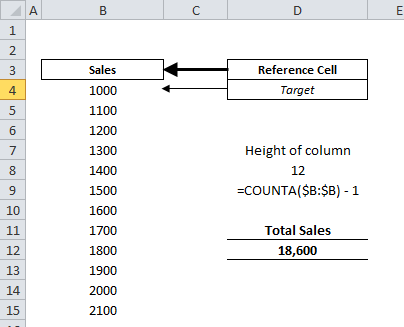 We now know that OFFSET can have five inputs - and any of these can themselves refer to other cells. In the example below rows will be added each month. The reference cell is the column header (B3). The target cell is the first with data in (B4). To get from B3 to B4 means moving down 1 row and across 0 columns. So the rows input is 1 and the cols input is 0.