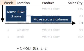 We will take cell B2 (highlighted) as the reference cell. Our target cell is E5, 3 rows down and 3 columns across from B2. So the formula needed is simply = OFFSET (B2, 3, 3).