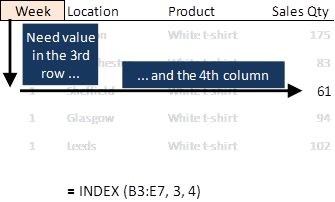 For our data table, the array is cells B3:E7. The row_num value is 3 but the col_num value needs to be 4 in order to refer to the 4th column in the array.